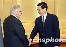 胡錦濤今天在人民大會堂會見了美國前國務(wù)卿基辛格博士,賓主進(jìn)行了友好交談。胡錦濤對基辛格長期致力于中美友好、為中美關(guān)系正;鞒龅臍v史性貢獻(xiàn)表示贊賞。