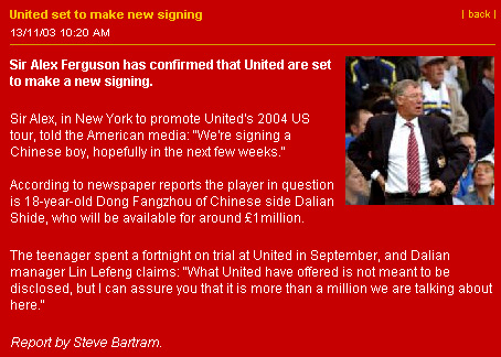 中新網(wǎng)11月14日電(記者 宋方燦)當(dāng)?shù)貢r(shí)間周三,曼聯(lián)俱樂(lè)部在其官方網(wǎng)站刊出最新消息,稱曼聯(lián)隊(duì)功勛教練弗格森已經(jīng)確認(rèn),曼聯(lián)將新簽入一名球員,而該球員就是中國(guó)小將董方卓。