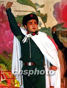 河南省安陽市超越集團(tuán)在日前舉辦的一場“非公經(jīng)濟(jì)之春”文藝晚會(huì)上,上演當(dāng)年樣板戲《智取威虎山》中的共產(chǎn)黨員形象。超越集團(tuán)有健全的共產(chǎn)黨組織健全。中新社記者:宋吉河