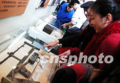 北京“井岡山大型展覽”十天引來七萬多觀眾。圖中兩位參觀的女孩正在討論眼前展品(紅軍當(dāng)年蓋房子的工具)是什麼。半個多世紀(jì)前,毛澤東等在中國南方叢山峻嶺的戰(zhàn)爭故事使許多參觀者感嘆。中新社記者:王麗南