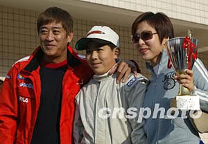 二OO三年全國卡丁車錦標(biāo)賽三十日在廣東三水舉行,柯受良之子柯有謙(中)獲得國家少年組冠軍,柯受良夫婦與兒子共同分享勝利喜悅。來自全國各地的五十多名選手參加本次比賽。中新社記者:趙振清