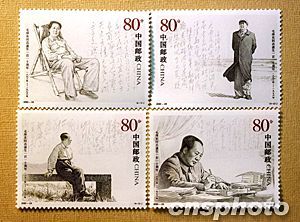 為紀(jì)念毛澤東同志誕辰110周年,中國(guó)國(guó)家郵政定于12月6日發(fā)行《毛澤東同志誕生一百一十周年》紀(jì)念郵票一套4枚,四枚郵票的圖案名稱(chēng)分別為:毛澤東在西柏坡、毛澤東在北戴河、毛澤東在廬山、毛澤東在廣州,面值均為80分。中新社記者:鄒憲