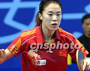 中國選手王楠在香港舉行的二零零三年女子世界杯乒乓球賽十二月十八日賽事上以4:0戰(zhàn)勝加拿大選手徐光宏。中新社記者:錢興強