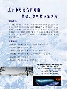 網(wǎng)站力求體現(xiàn)“百年奧運,中華圓夢”精神和中華民族海內(nèi)外共同辦奧運的民族團結(jié)精神,成為港澳臺僑同胞認識、了解并參與共建北京奧運場館的一個窗口。
