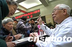 當(dāng)年曾是毛主席醫(yī)療小組成員的王新德教授(右)十二月二十六日在北京醫(yī)院用為市民們義診來紀念毛主席誕辰110周年。中新社記者:史利