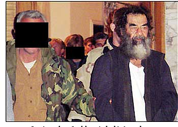 在被從骯臟的地下藏身地拖出來(lái)之后,他就被帶到了附近底格里特壯麗的大理石皇宮中。當(dāng)他被帶進(jìn)從前富麗堂皇的皇宮司令部的一個(gè)房間時(shí),看到房間里擠滿(mǎn)了喜悅的美國(guó)部隊(duì),66歲的薩達(dá)姆看上去非常不知所措。