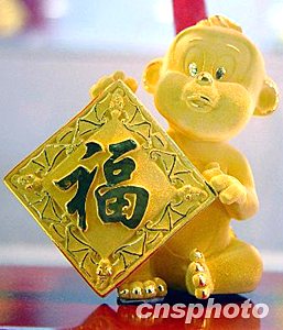 2004年1月17日,安徽省淮北市一家珠寶首飾店內(nèi)一尊尊純金打造栩栩如生的“金猴”,準(zhǔn)備在春節(jié)黃金周期間,吸引消費(fèi)者選購(gòu)。猴年將至,猴金飾品日益成為人們的新寵。謝正義 攝