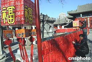 猴年春節(jié)在即,第三屆北京民俗文化節(jié)暨第六屆東岳廟文化廟會一月二十日即將在著名的東岳廟舉辦。十九日工作人員正在加緊布置“福”路,迎接祥和興旺的新春。中新社記者:張勤