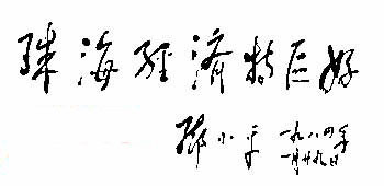午飯前,小平同志與澳門知名人士馬萬祺及珠海的領(lǐng)導(dǎo)坐在珠海賓館翠城餐廳休息。珠海賓館總經(jīng)理張倩玲想在餐廳中間擺張桌子,請小平同志題詞。李天增對她說,小平同志在深圳也沒有題,現(xiàn)在也不一定會題,還是把桌子擺邊上一點(diǎn)。說完李天增便忙著排座位,回頭一看,鄧小平已主動走過去,伏案揮毫,不暇思索地寫下“珠海經(jīng)濟(jì)特區(qū)好”。