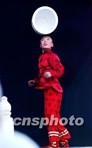 一名十歲的山西兒童春節(jié)期間在北京廟會上從容表演雜技“頂壇”。據(jù)悉,在中國民間有許多孩子從五歲左右開始習練雜技藝術,小小年紀便已身懷“絕技”。中新社記者:王麗南
