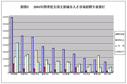 中新網(wǎng)2月4日電 2003年四季度全國(guó)人才市場(chǎng)供求信息顯示,全國(guó)人才市場(chǎng)人才供需兩旺,但各專業(yè)間供求形勢(shì)差異較大。市場(chǎng)營(yíng)銷、機(jī)械、計(jì)算機(jī)、建筑等專業(yè)依然是人才市場(chǎng)的熱門(mén)專業(yè),職位需求量保持旺盛。