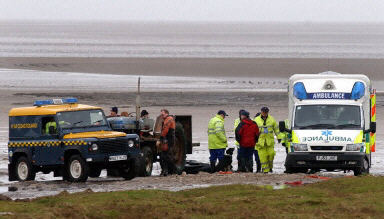救援人員在英格蘭西北部莫克姆灣海灘搜尋遇難者