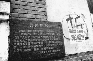 2月16日,記者(注:人民日?qǐng)?bào)記者)在天津民主道23號(hào)曹禺舊居院墻上看到,緊挨著天津市文物局和天津市河北區(qū)文物管理所等單位懸掛的兩塊曹禺舊居紀(jì)念牌的,是一個(gè)約60厘米高的墨寫(xiě)的“拆”字(如圖),旁邊還張貼著花花綠綠的各類(lèi)“搬家公司”的小廣告。旁邊有的住家已人去樓空,三三兩兩收破爛的外地人正在曹禺故居外來(lái)回轉(zhuǎn)悠。