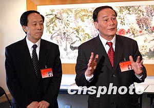 二月二十一日,王岐山(右)在北京人大會(huì)議選舉市長(zhǎng)投票結(jié)束后,看望議案組工作人員。中新社記者:張宇