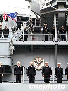 中國海軍東海艦隊司令員趙國鈞中將在碼頭舉行儀式,歡迎美艦到訪。
