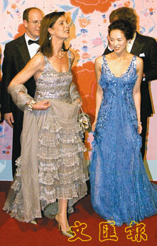席上,章子怡獲阿爾伯特王子(Prince Albert)垂青,兩人不時以英語交談,共舞一曲。章子怡當(dāng)晚戴上總值500萬港元的耳環(huán)和手鐲,穿著一襲藍(lán)色性感晚裝,明艷照人,與嘉露蓮(Princess Caroline of Hanover)公主爭妍斗麗。