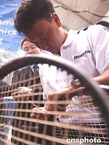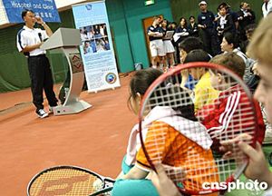 四月三日,美籍華人網(wǎng)球明星張德培應(yīng)北京和睦家醫(yī)院之約,來到嘉里健身俱樂部網(wǎng)球中心慈善演講。此次活動的門票收入全部捐獻(xiàn)給美國教育健康基金會,用于幫助中國貧困地區(qū)醫(yī)療衛(wèi)生事業(yè)和孤殘病患兒童。作者:賈國榮