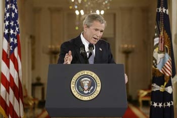 布什在美國(guó)黃金時(shí)間舉行實(shí)況轉(zhuǎn)播的記者招待會(huì),是伊拉克戰(zhàn)爭(zhēng)開(kāi)始以來(lái)的第一次。