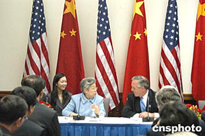 四月二十一日在美國(guó)華盛頓舉行的第十五屆中美商貿(mào)聯(lián)委會(huì)上,中國(guó)國(guó)務(wù)院副總理吳儀告訴美國(guó)人:中美經(jīng)貿(mào)并非此消彼長(zhǎng),而是互利雙贏。圖為吳儀與美國(guó)商務(wù)部部長(zhǎng)埃文斯共同會(huì)見記者。作者:余東暉