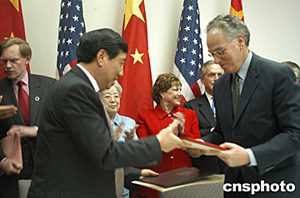 四月二十一日,在美國(guó)華盛頓結(jié)束的中美商貿(mào)聯(lián)委會(huì)達(dá)成了多項(xiàng)共識(shí),并簽署八項(xiàng)經(jīng)貿(mào)協(xié)議和文件。圖為中國(guó)交通部副部長(zhǎng)洪善祥(左)與美國(guó)運(yùn)輸部副部長(zhǎng)舍恩(右)簽署中美《海運(yùn)協(xié)定》外交照會(huì)換文及聯(lián)合聲明。作者:余東暉