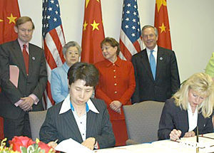 中美在四月二十一日結(jié)束的第十五屆中美商貿(mào)聯(lián)委會(huì)上,就“高技術(shù)出口最終用戶訪問”達(dá)成協(xié)議,這將推動(dòng)美國(guó)對(duì)華高科技出口。圖為中國(guó)商務(wù)部副部長(zhǎng)馬秀紅(左)與美國(guó)商務(wù)部副部長(zhǎng)杰斯特(右)在簽字。作者:余東暉