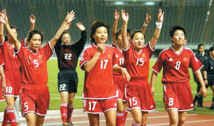 下半時15分鐘,曲飛飛接到浦瑋的傳球后,并沒有急于出腳,她在冷靜的調(diào)整、撥球后,在最合適的位置起腳,韓國隊(duì)門將金正美努力地伸出右臂,但飛飛的射門力拔千鈞。范運(yùn)杰、滕巍、浦瑋興奮得恨不得把飛飛按倒在地。直到下半時35分鐘,海濤才舍得用張穎換下飛飛,因?yàn)轱w飛的腿已經(jīng)被對方踢得青一塊紫一塊。