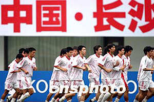 四月三十日,中國國奧足球隊(duì)在湖南長沙賀龍?bào)w育場進(jìn)行場地適應(yīng)性訓(xùn)練,為五月一日晚迎戰(zhàn)韓國國奧隊(duì)做準(zhǔn)備。中新社記者:盛佳鵬