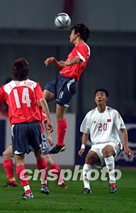 中國國奧隊上半場比賽最有威脅的一次射門出現(xiàn)在第三十五分三十秒,閻嵩接孫祥右路開出的角球后搶點頭球射門偏出,驚得韓國國奧隊門將金永光一身冷汗。
