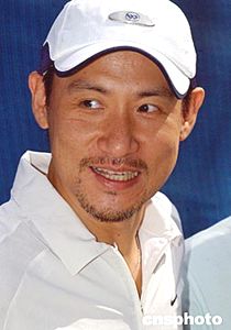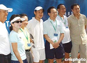 香港影視紅星張學(xué)友與著名音樂人區(qū)丁玉,五月九日代表香港明星隊(duì)參加在香港舉行的網(wǎng)球團(tuán)體邀請賽網(wǎng)球雙打組合。