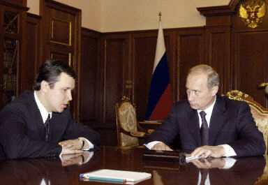 俄羅斯車臣共和國總統(tǒng)艾哈邁德·卡德羅夫9日在格羅茲尼狄莫納體育館爆炸中身亡后,俄總統(tǒng)普京當天下午接見了“火線接任的”車臣代總統(tǒng)謝爾蓋·阿布拉莫夫。圖為普京(右)在克里姆林宮與阿布拉莫夫舉行會談。