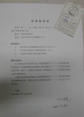 目前,他已聘請了知名律師,寫好了起訴狀書,要求法院判決中國足協(xié)賠償他一分錢的精神損失費(fèi),“我已經(jīng)于8日下午向北京市崇文區(qū)人民法院立案庭以掛號信的方式遞交了起訴書!”