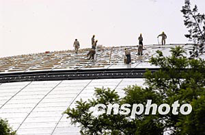 五月初,地處北京市中心的國家大劇院建筑工地上,建筑工人在雨季來臨前站在建筑穹體表層,加緊安裝金屬保護結(jié)構(gòu)。該建筑由國家財政投資三十億元興建,目前穹頂建筑施工是該建筑最具難度的施工項目之一。中新社記者:鄒憲