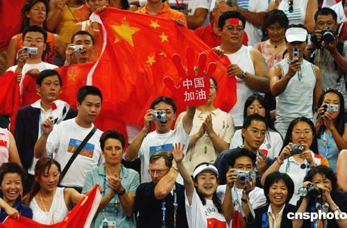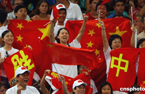 當(dāng)?shù)貢r(shí)間8月19日,在中國選手張寧與荷蘭選手之間進(jìn)行了女子羽毛球單打比賽的決賽,圖為場(chǎng)外觀眾為中國隊(duì)吶喊助威。