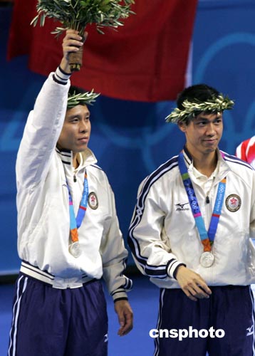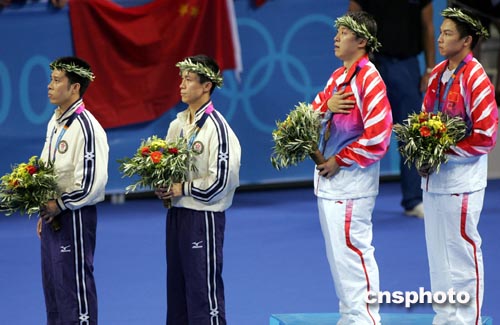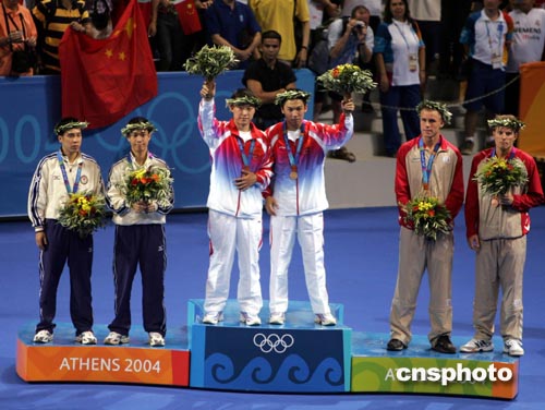 雅典當地時間8月21日下午,中國乒乓球選手馬琳、陳玘在男雙決賽中以4比2戰(zhàn)勝香港選手李靜、高禮澤,獲得本屆奧運會男子雙打冠軍。中新社記者:任晨鳴