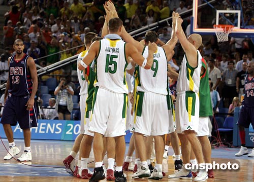 中新社雅典八月二十一日電 繼雅典奧運(yùn)首場(chǎng)小組賽被波多黎各擊潰后,美國(guó)夢(mèng)六隊(duì)今天再度落敗。立陶宛憑借其神準(zhǔn)的三分球以九十四比九十戰(zhàn)勝美國(guó)隊(duì),這也使美國(guó)男籃遭遇到其奧運(yùn)史上的第四場(chǎng)失利。
