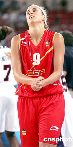 圖為當?shù)貢r間8月20舉行的女子籃球賽中,西班牙隊員在球隊不敵美國隊后扼腕痛惜。