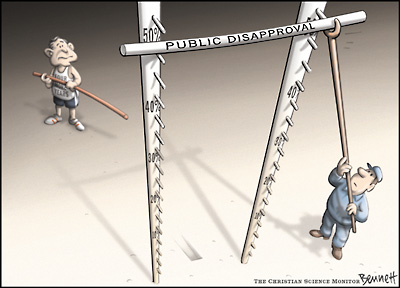 中新網(wǎng)8月22日電 911事件后,美國總統(tǒng)布什的民眾支持率曾達到歷史頂點。但時至今日,布什的民眾不支持率卻是節(jié)節(jié)攀升。分析人士指出,如果民眾的不支持率超過50%,這對于希望蟬聯(lián)總統(tǒng)職位的布什來說,將是一種難以逾越的危機。(來源:基督教科學(xué)箴言報)