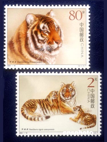 中國國家郵政局于八月二十三日發(fā)行《華南虎》特種郵票一套二枚,這兩枚郵票的名稱均為華南虎,面值分別為八十分與二元。全世界的現(xiàn)生虎只有一種,而華南虎是其中一個亞種的俗稱,僅分布于中國長江以南。華南虎體形較小,黑色條紋較寬,屬極度瀕危動物,其野生種群不足三十只,在中國的動物園內也只有五十只,與大熊貓同被列入國際自然與自然保護聯(lián)盟(IUCN)十大瀕危物種之列。中新社記者:鄒憲