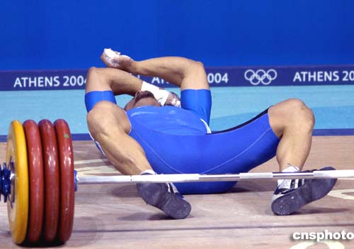 圖為85公斤級(jí)男子舉重比賽銅牌得主希臘選手迪馬斯在比賽中。