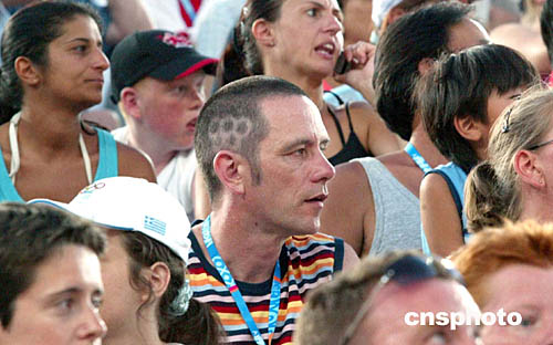 圖為一名觀眾的頭上剃了個奧運(yùn)五環(huán)的圖,非常醒目。