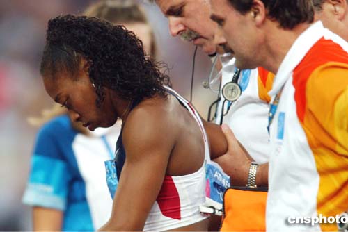 在當(dāng)?shù)貢r(shí)間22進(jìn)行的女子100米跨欄比賽中,美國選手Gail Devers因摔倒而不得不離開賽場。
