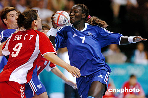 圖為在當(dāng)?shù)貢r(shí)間8月23日舉行的女子手球賽法國(guó)隊(duì)對(duì)陣韓國(guó)隊(duì)的比賽中,法國(guó)選手Nodjialem Myaro和韓國(guó)選手Cha Youn一對(duì)一的較量的場(chǎng)面。