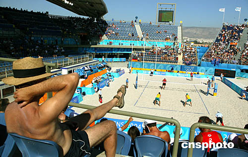 圖為一球迷在觀看沙灘排球比賽的畫(huà)面。