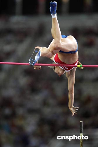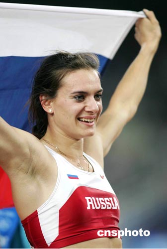在全場觀眾的歡呼聲中,俄羅斯女將伊辛巴耶娃今晚在雅典奧運會田徑賽場神奇般地越過四米九一,不僅將奧運會女子撐桿跳金牌歸于名下,并且創(chuàng)造了田徑賽事開賽以來首項世界紀錄。