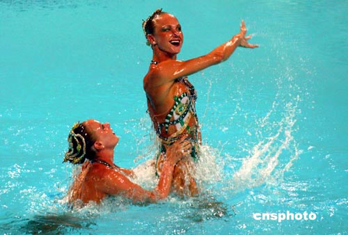 當(dāng)?shù)貢r(shí)間8月24日晚,美國(guó)隊(duì)在雅典奧運(yùn)會(huì)進(jìn)行雙人花樣游泳比賽。中新社記者:王瑤
