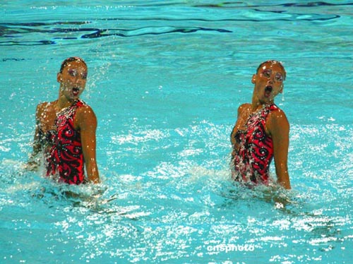 當(dāng)?shù)貢r(shí)間8月24日晚,埃及隊(duì)在雅典奧運(yùn)會(huì)進(jìn)行雙人花樣游泳比賽。中新社記者:王瑤