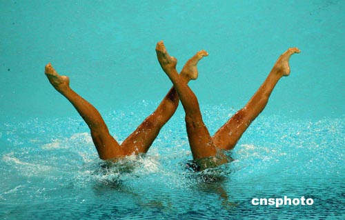 當(dāng)?shù)貢r間8月24日晚,加拿大隊在雅典奧運會進行雙人花樣游泳比賽。中新社記者:王瑤