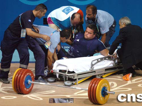 在當(dāng)?shù)貢r(shí)間8月25進(jìn)行的男子舉重比賽中,挪威選手因?yàn)槭д`膝蓋受到傷害,被救護(hù)人員抬上擔(dān)架。