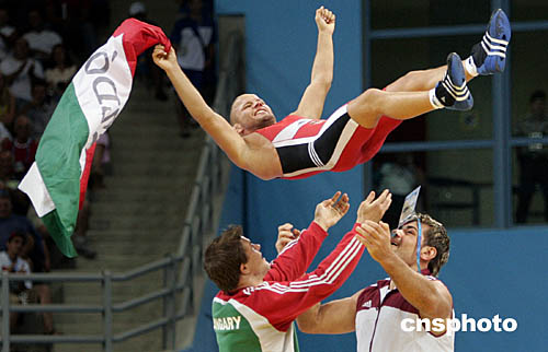 圖為匈牙利選手毛約羅什(Istvan Majoros)在雅典奧運(yùn)會摔跤男子55公斤級決賽中奪冠后慶祝的場面。