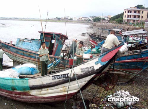 今年第18號臺風“艾利”8月25日下午16:30在福建省福清市高山鎮(zhèn)登陸后,正在一線抗臺風的福清邊防官兵迅速轉(zhuǎn)入緊急救災,為群眾挽回經(jīng)濟損失200多萬元人民幣,確保了省委省政府提出的不死人、少損失的要求,受到當局和群眾的一致好評。圖為橋尾邊防派出所官兵協(xié)助當?shù)厝罕娂庸虧O船。作者:朱明海